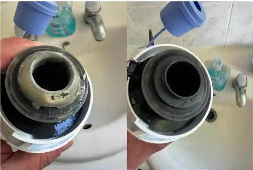 Examining the toilet’s flush mechanism, the source of this leak was clear – a large mineral build up on the flush’s sealing valve. This was stopping the valve from closing and in turn letting water flow continually into the bowl.